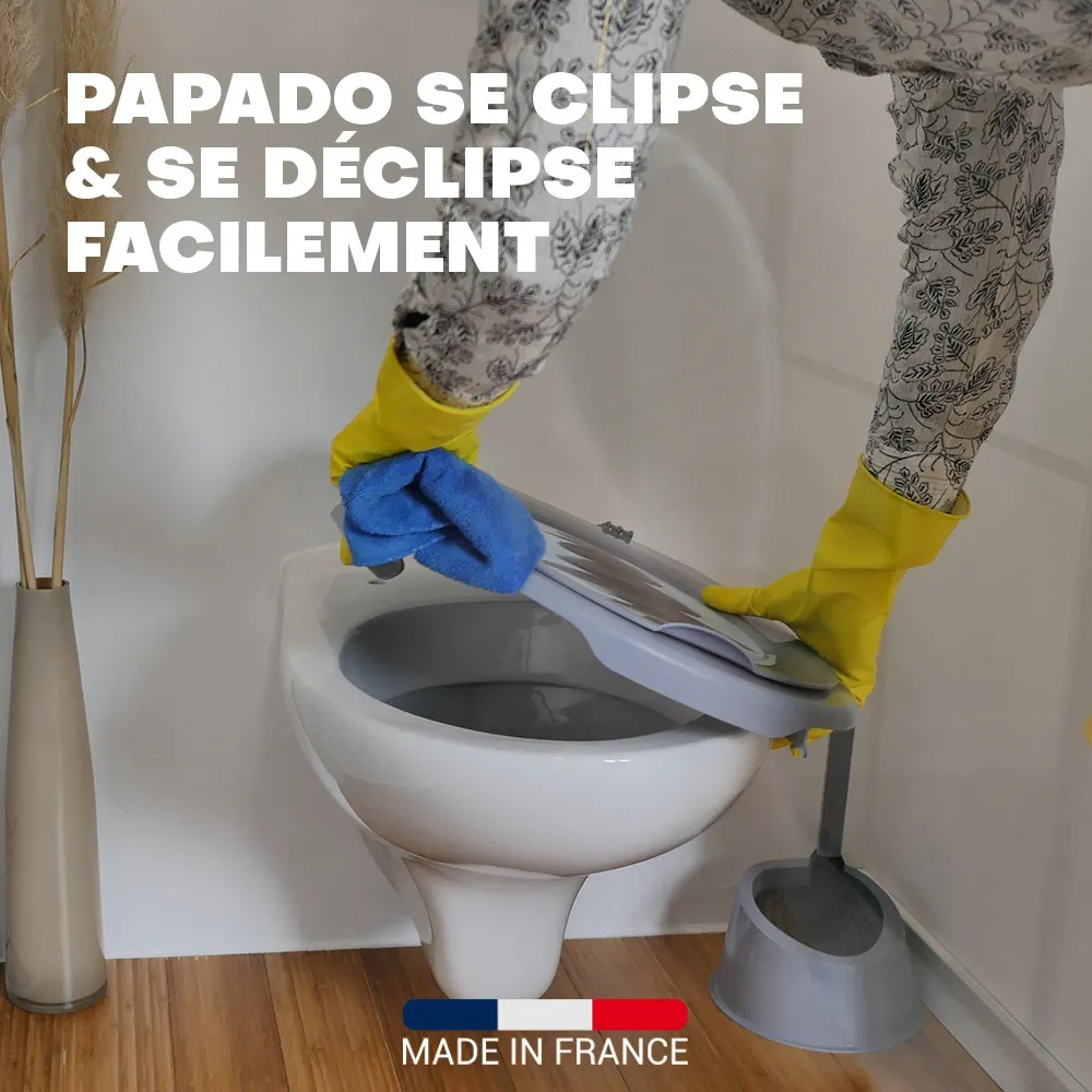 Le grand atout de Papado®, c’est son système clipsable/déclipsable : vous pouvez retirer l’abattant en 2 secondes pour un nettoyage complet, puis le remettre tout aussi facilement. Pas besoin d’outils, et c’est ultra sécurisé une fois fixé.