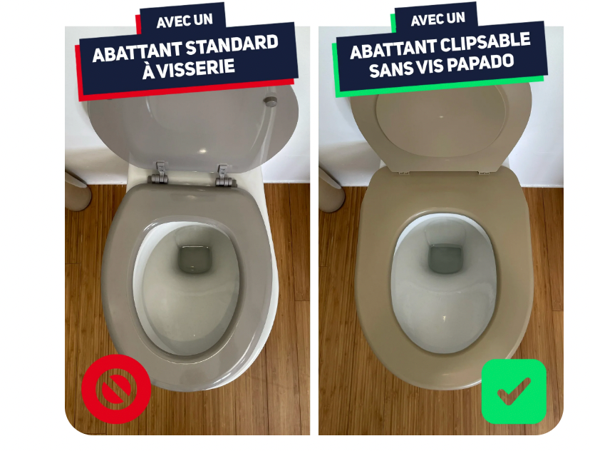 Grâce à son système clipsable/déclipsable, Papado® vous permet de retirer l’abattant sans outil, en un seul geste. Fini les saletés et bactéries invisibles entre les fixations !