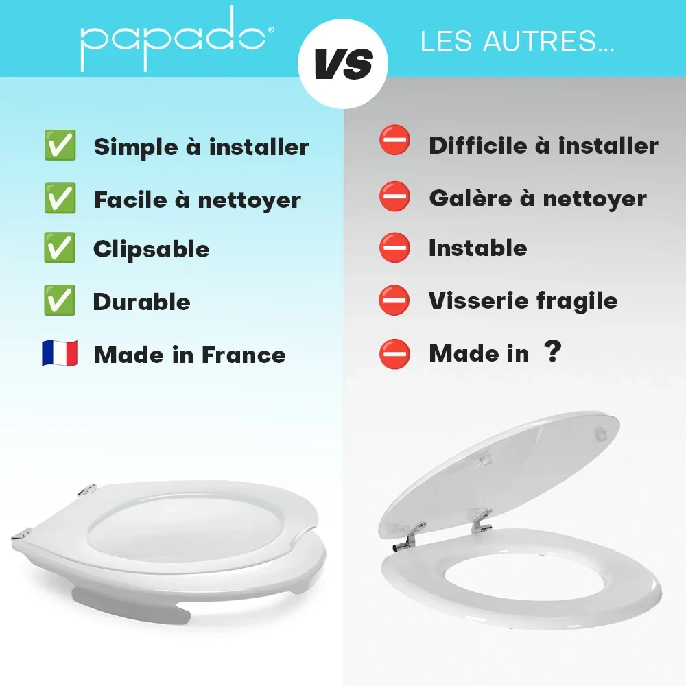 Avec Papado®, tout change. Grâce à son système de fixation renforcée et clipsable, l’abattant reste parfaitement en place, lavage après lavage, sans jamais vaciller.